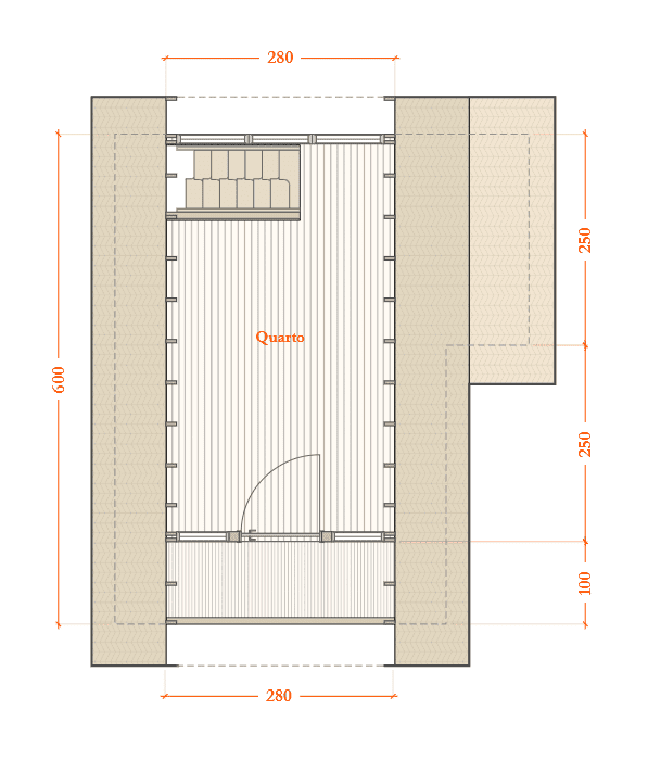 O mezanino possui um quarto com espaço para abrigar uma cama de casal.