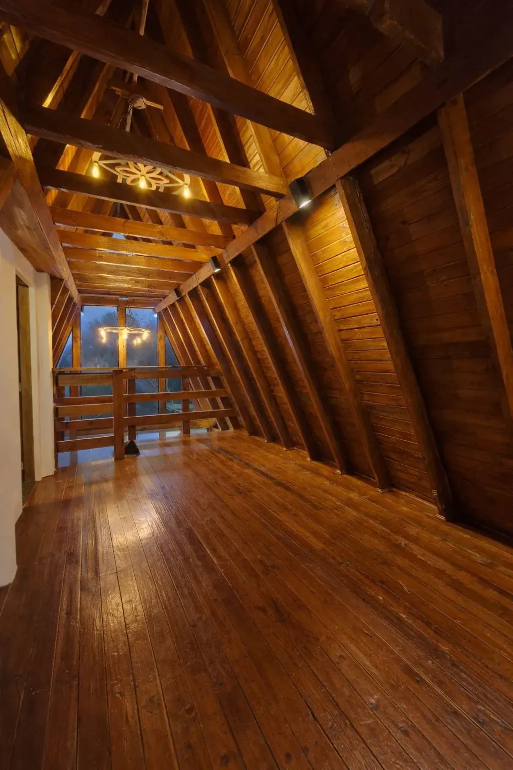 Por fim, o chalé possui dois andares, com mezanino para sentar no fim de tarde e relaxar tomando um chocolate quente, enquanto você descansa em sua cadeira de balanço.