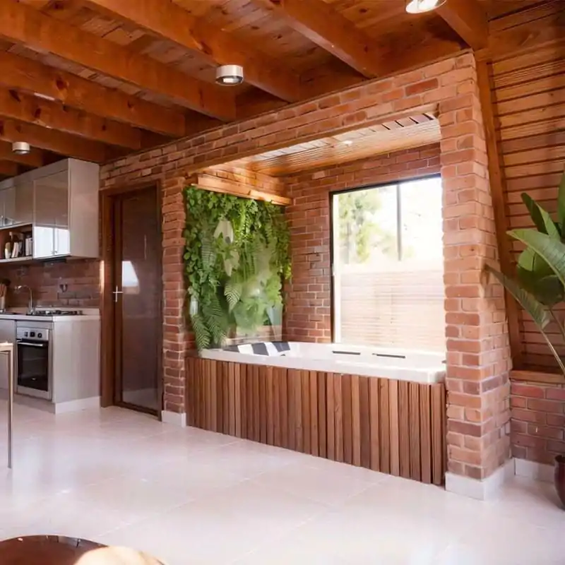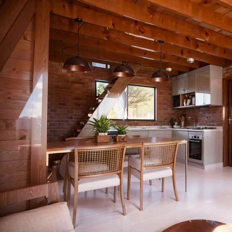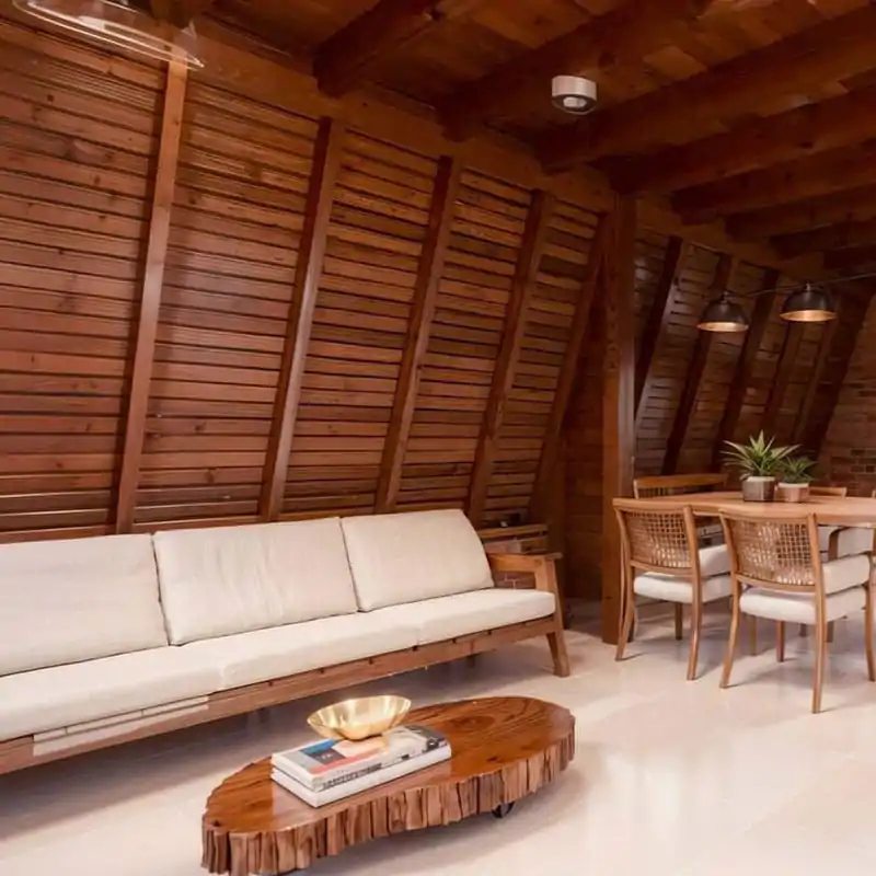 Este chalé de dois andares possui um acabamento mais elegante com forro em madeira, ajudando no conforto térmico, acústico, além de deixar o ambiente aconchegante e romântico.