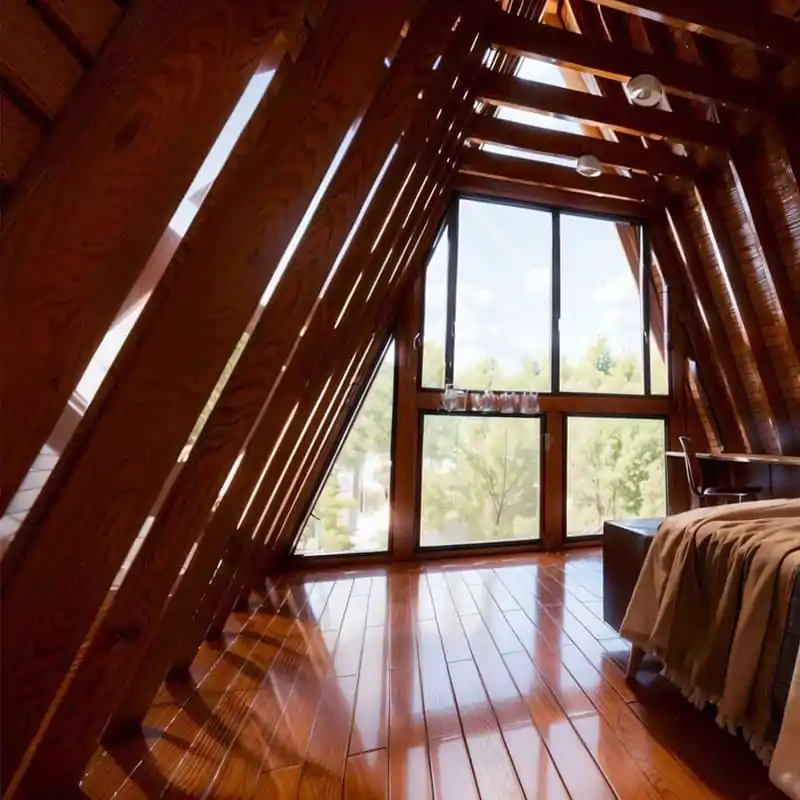 O kit chalé Suiço A-Frame CasaPinus foi projetado para  ventilação e iluminação, as quais se dão através da fachada frontal, que é composta de vidro e porta, que liga aos fundos do próprio chalé. Assim possibilita-se a ventilação cruzada.